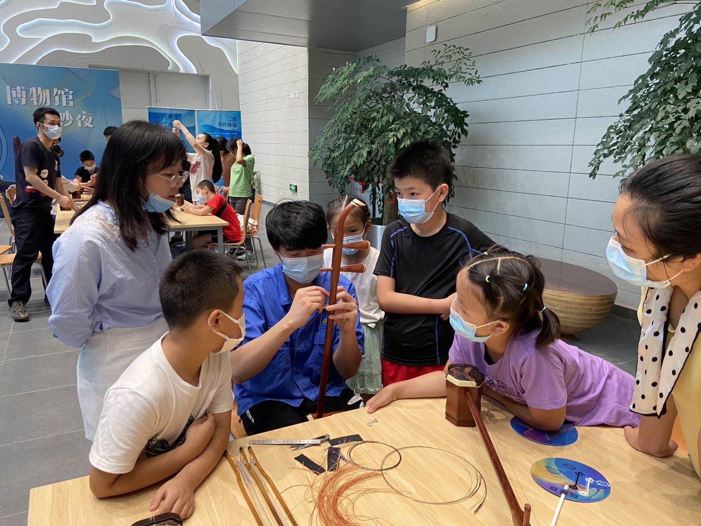 7月25日晚间,闵行博物馆举办夜间活动,将民族乐器制作、闵博特色民乐主题讲解,以及民族乐器文创周边售卖带到了博物馆,引来数百名小朋友和家长报名参与。
