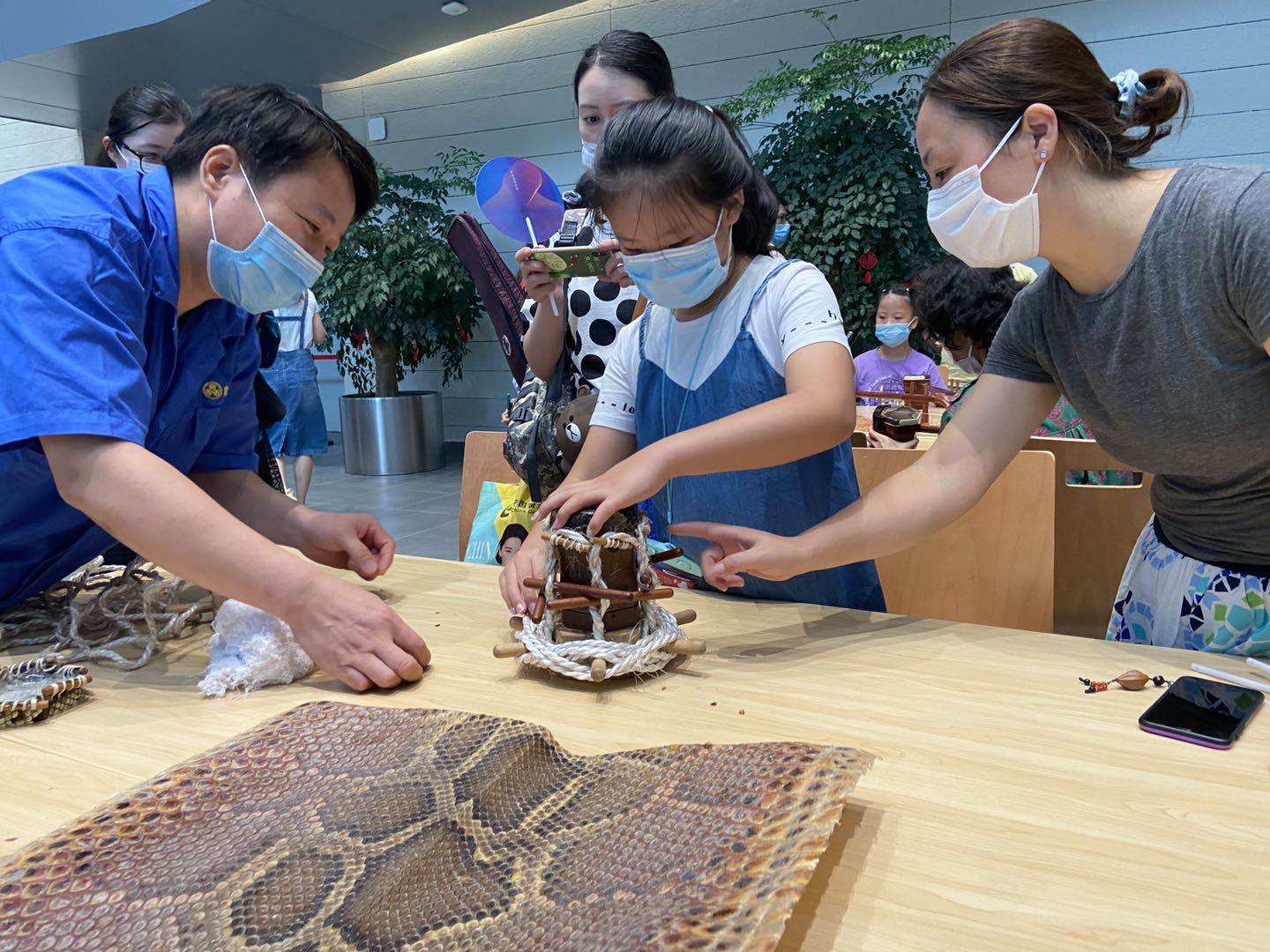 在讲解中,孩子们了解到现在二胡制作所用的蟒皮都来自专业养殖场,野生蟒蛇现在是保护动物。而在制作过程中,只有蟒蛇背部的皮可以使用。