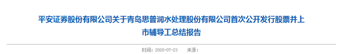 7月23日,青岛监管局披露了青岛思普润水处理股份有限公司(以下简称“思普润”)首次公开发行股票并上市辅导工总结报告。