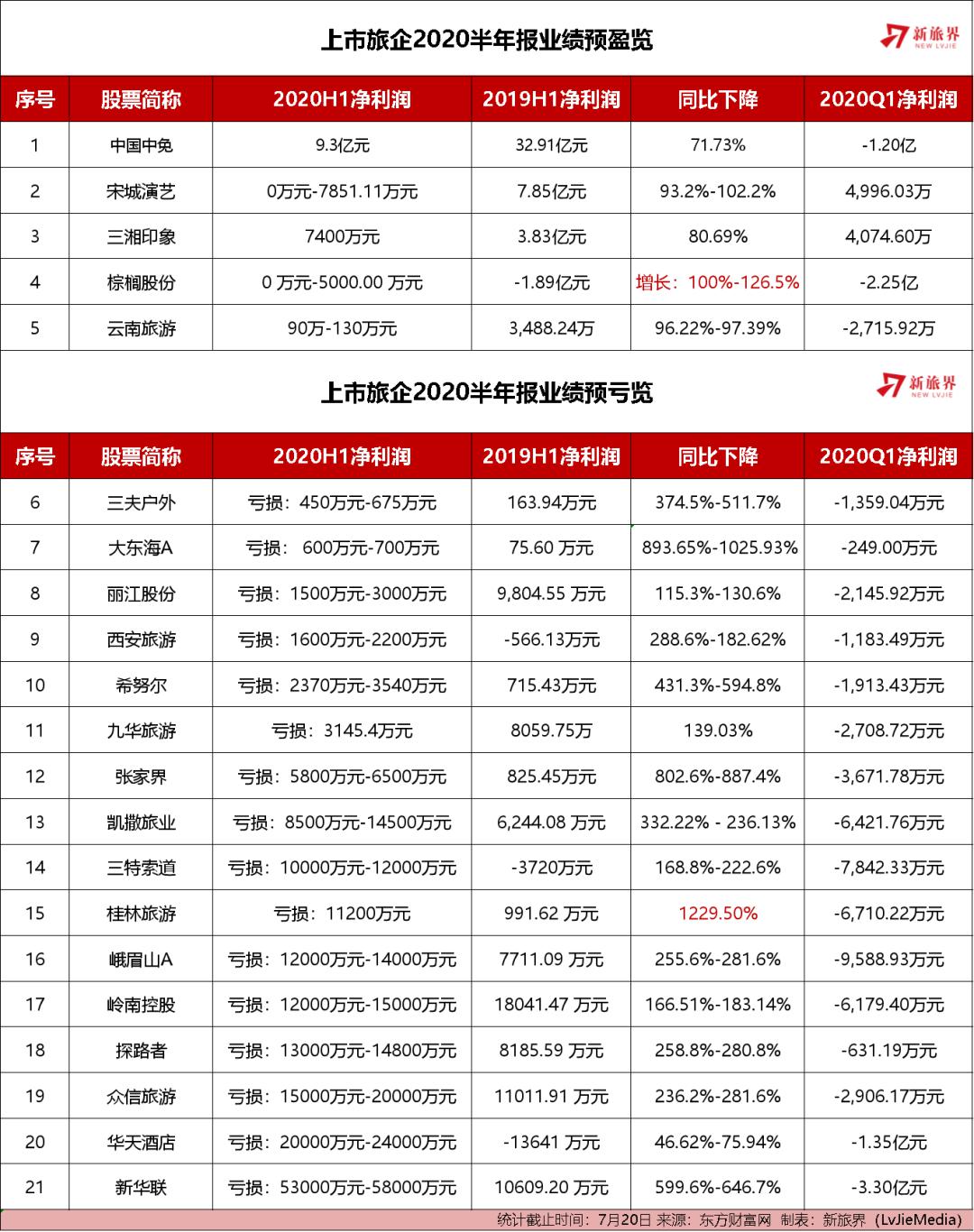 接下来,A股旅企2020半年报将在8月末前陆续出炉,现下先来看看已披露预告/半年报的旅企们在过去的180多天里,谁最能扛?谁在回血?又有谁即将倒下吧?
