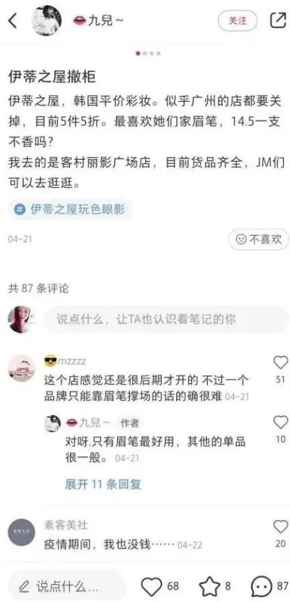 不过,伊蒂之屋近年在渠道和产品创新上的一系列举措并没有奏效。对于此次关闭中国门店,网友们在惋惜之余,也不乏对其品牌力、产品力的质疑声。不少网友表示,“五折也没啥好买”“一个品牌只能靠眉笔撑场的话的确很难”。