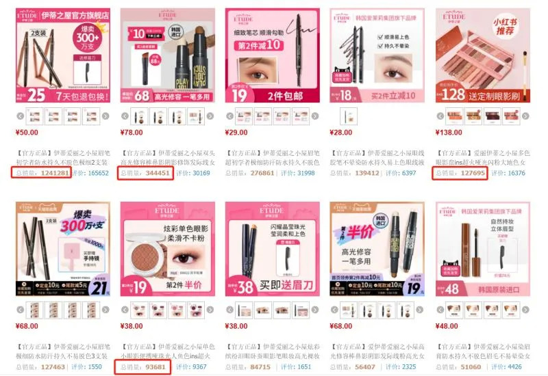 青眼在伊蒂之屋天猫旗舰店看到,一如网友所言,眉笔确实撑起了半边天,两支装眉笔总销量超120万,修容棒、眼影盘等产品总销量仅有几十万甚至几万,总体而言,缺乏更多具有竞争力的产品。
