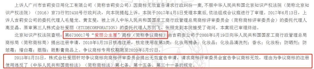不过,伊蒂之屋也没有放过任何一个夺回商标、挽回形象的机会。例如,针对爱丽原中国总代广州市吉莉安日用化工有限公司提交注册“爱丽公主屋”商标的行为,株式会社爱丽(爱茉莉太平洋集团旗下公司)曾于2015年对第6730017号“爱丽公主屋”商标(简称争议商标)向商标评审委员会提出无效宣告申请,请求商标评审委员会宣告争议商标无效。