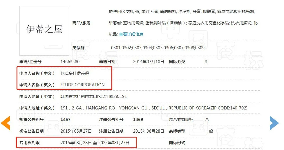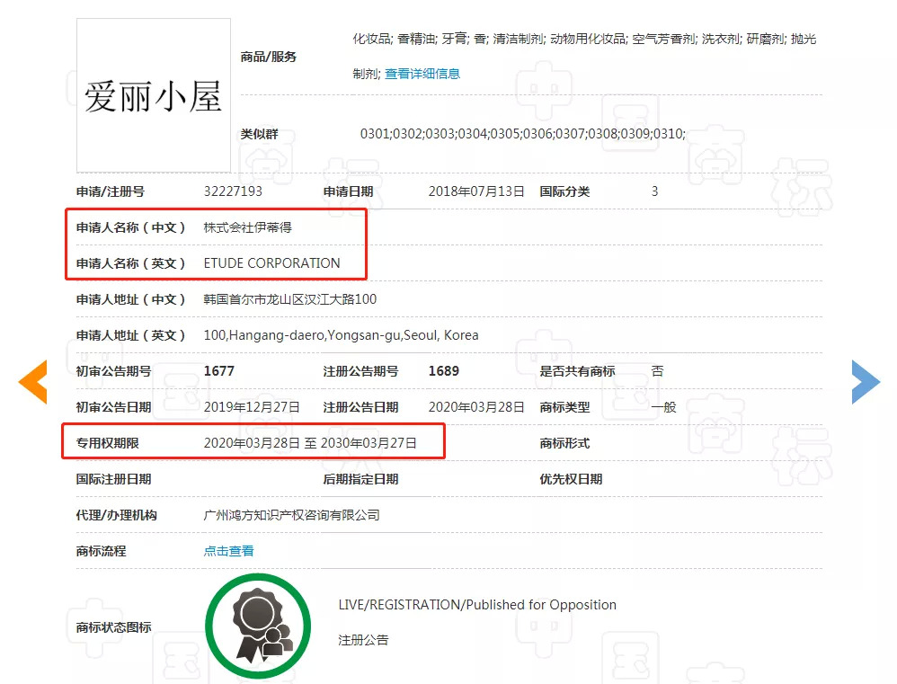 青眼注意到,“伊蒂之屋”第3类商标的专利权人株式会社伊蒂得(也叫株式会社爱丽),现已成为“爱丽小屋”第3类商标的专利权人,使用期限自2020年03月28日至2030年03月27日。