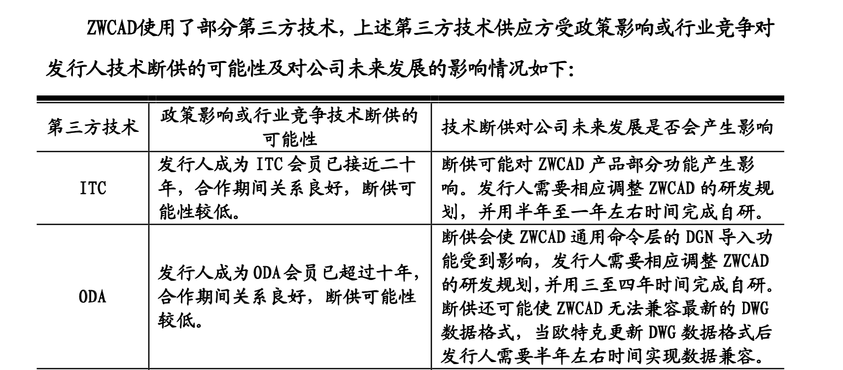 对此,中望软件回复称:ZWCAD的确使用了部分第三方技术,但对ITC和ODA的技术依赖程度较低。而如果断供,ITC断供可能对ZWCAD产品部分功能产生影响,其需要用半年至一年左右时间完成自研;若ODA断供,则需要用三至四年时间才能完成自研。