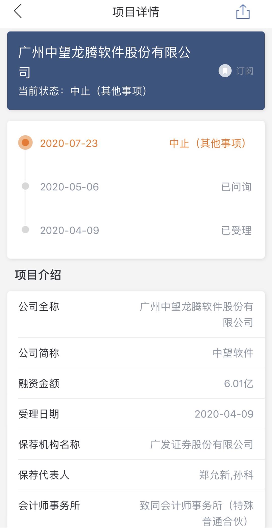 2020年7月23日,广州中望龙腾软件股份有限公司因发行人的保荐人、证券服务机构被中国证监会已发采取限制业务活动、责令停业整顿、指定其他机构托管或者接管等监管措施,尚未解除。根据《审核规则》第六十四条(三),本所中止其发行上市审核。