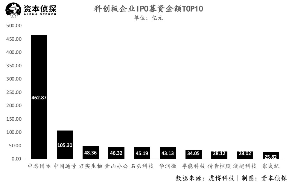 另一家芯片明星企业、中国AI芯片独角兽寒武纪紧随中芯国际,于7月20日正式挂牌科创板。寒武纪科创板过会时间为68天,是除中芯国际外过会最快的企业,其募资金额达到25亿元,挤入科创板IPO募资金额TOP 10。