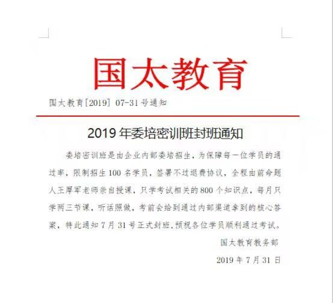 来自福建泉州的连先生于今年7月20日在聚投诉上表示,他花费31640元报考密训班,对方称“这个班型就是针对没有时间、没有基础的学员,还有消协老师王厚军进行讲课。考试前学校会邮寄内部的教材和押题试卷,背下来考过72分肯定没问题。”