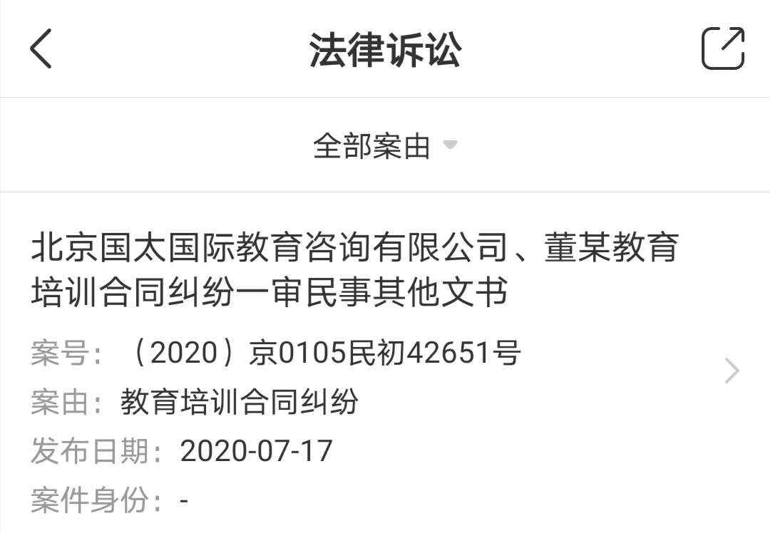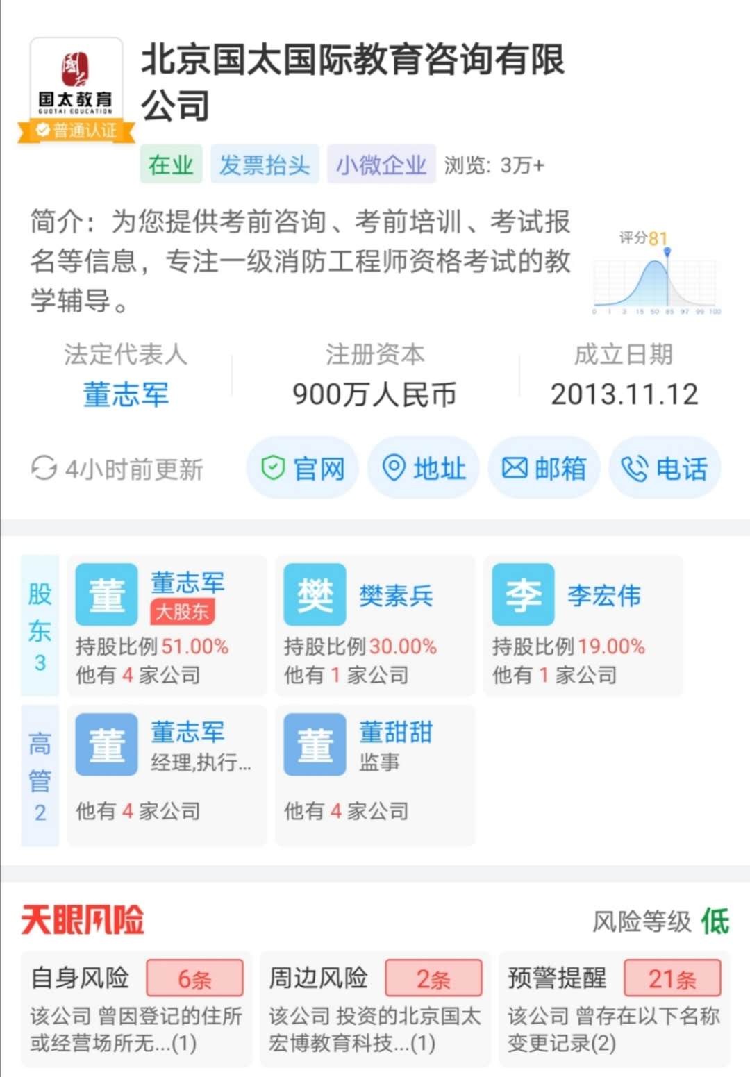 据天眼查显示,国太教育的法人为董志军,注册资本900万人民币。其中,董志军占股51%,为最大股东。范素兵持股30%,李宏伟持股19%。2020年7月17日曾涉及一例有关教育培训合同纠纷的法律诉讼。
