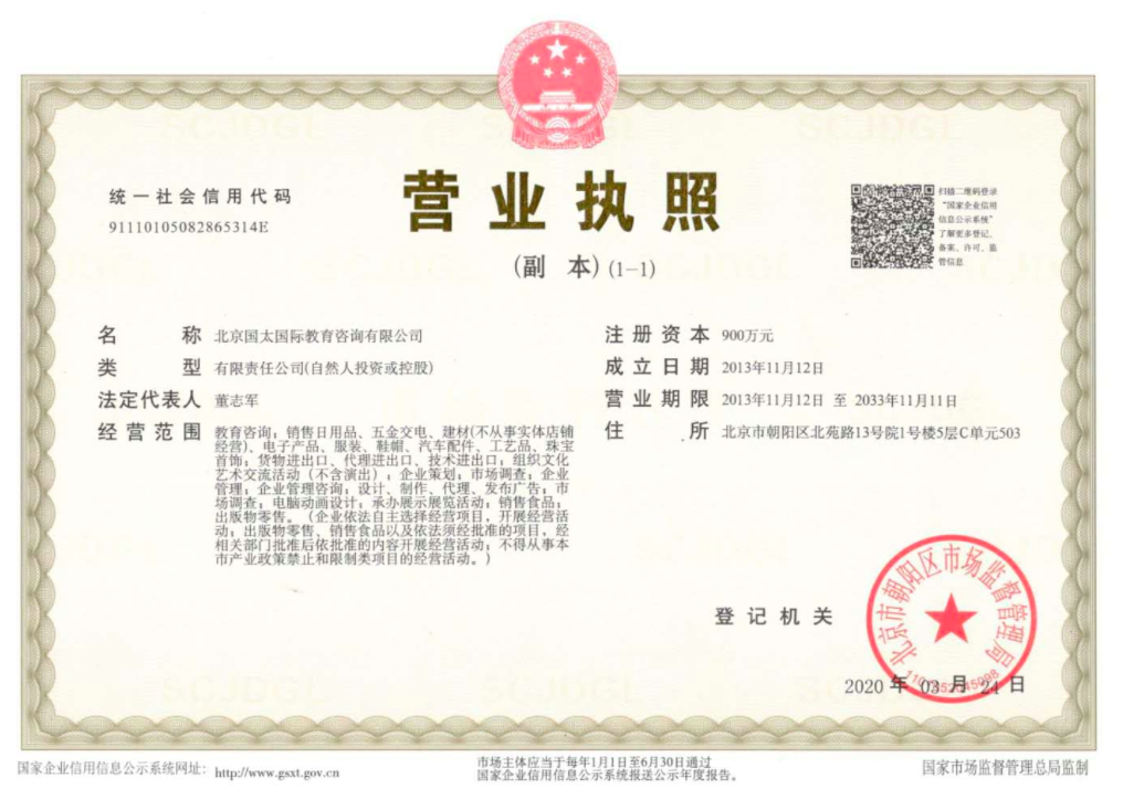 其营业执照显示,国太教育的经营范围包括:教育咨询;销售日用品;货物进出口;组织文化艺术交流活动(不含演出);企业策划;销售食品;出版物零售等。关于教育方面仅限于咨询服务,并无教育培训资质。