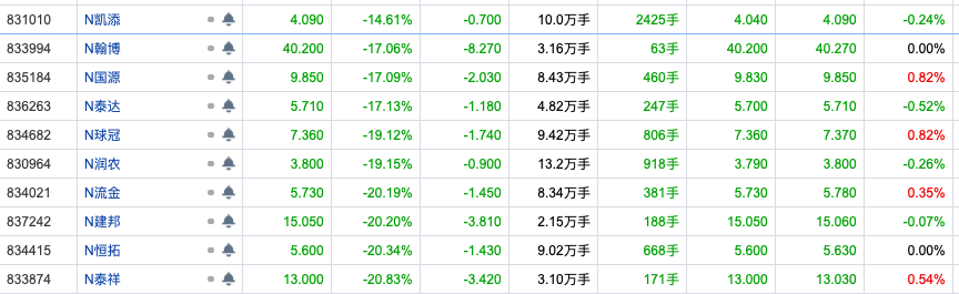 盘面上,首批32只精选层个股全线高开,但在9:15至9:25的集合竞价阶段,多数精选层个股股价就已出现明显下跌,至9:30后的连续竞价阶段,相应个股跌幅进一步扩大,快速翻绿。包括N恒拓、N凯添在内的10多只个股因盘中价格较开盘价下跌达到或超过30%、60%触发临时停牌,上演股价“过山车”。