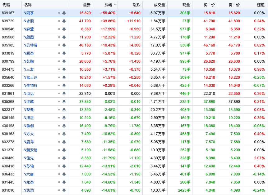 截至7月27日收盘,32只精选层个股中,除去N创远收平外,仅有10只个股收涨。其中,N同享录得55.40%的最大涨幅。而剩余的21只个股首日全部翻绿,跌幅超过20%的就有4只个股,这也意味着这21只个股在精选层交易首日全部破发。