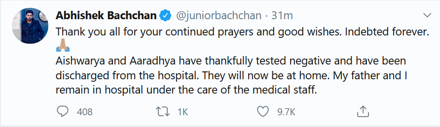 阿米塔布和儿子阿布舍克自7月11日以来一直住院治疗,而艾西瓦娅和阿拉迪亚在出现轻微症状后于7月12日入院治疗。