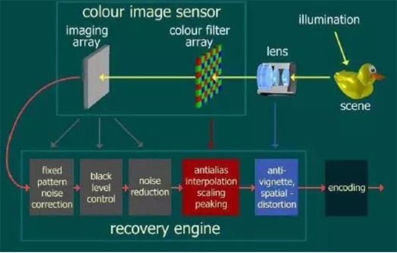 摄像头的工作原理是将拍摄对象通过镜头( lens),将生成的光学图像投射到传感器上(colour image sensor),然后光学图像被转换成电信号,进行降噪等操作后,电信号再经过模数转换变为数字信号,数字信号经过 DSP 加工处理,再被送到处理器中进行解码( encoding)处理,最终转换成我们能够看到的图像。