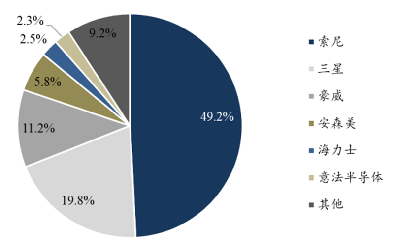 市场集中度高,龙头企业遥遥领先。根据 Yole 数据, CIS 市场集中度较高, CR3为 80.2%,其中索尼占比 49.2%,三星占比 19.8%,豪威占比 11.2%。根据群智咨询数据, 2019 年 CIS 全球出货量 47 亿颗,出货量前三名分别为索尼( 13.2 亿颗),三星( 7.2亿颗),豪威( 6 亿颗),排名前三厂商出货量遥遥领先其他厂商,龙头地位稳固。