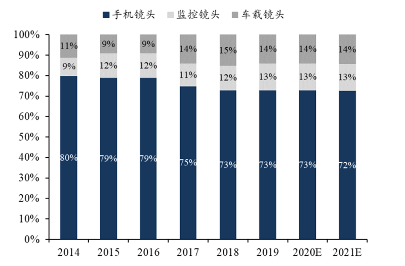镜头市场规模持续增长,下游应用占比稳定。受益于手机、车载、监控等市场的发展,镜头市场规模连年递增,根据中国产业信息网数据, 2014-2019 年,全球镜头市场规模从 27.55 亿美元增长到 67.43 亿美元, CAGR 为 16.09%,预计 2021 年可达约 75.64亿美元。