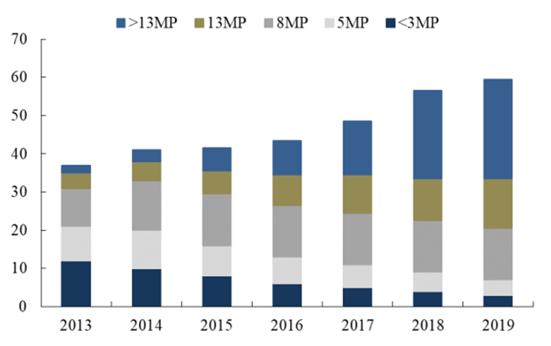 ▲手持设备 CIS 出货量按像素分布(亿个)