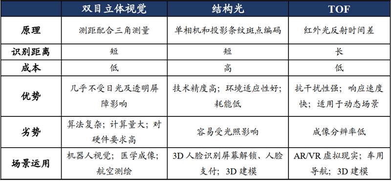 实现 3D Sensing 的技术有三种:双目立体成像、结构光和 TOF。其中结构光技术最为成熟,已经大规模应用于工业 3D 视觉领域, TOF 则由于自身特性快速在手机等移动终端加以应用。