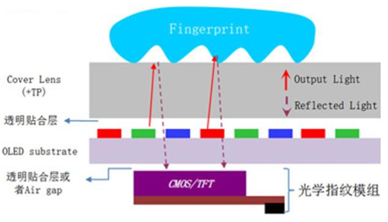 光学屏下指纹有望大规模应用于 LCD。光学屏下指纹目前大部分是用在 OLED 屏幕上,其原理是当用户按压 OLED 屏幕后, OLED 产生的光线会照射手指纹理,然后光线再反射到屏幕下的指纹识别传感器上,产生指纹图像,进而与数据库进行对比分析,最终识别指纹。目前光学屏下指纹识别技术成熟,是屏下指纹识别的主流。智能手机使用的光学屏下指纹放弃了传统光学系统,改用手机屏幕作为光源,因此自发光的 OELD屏幕一直是光学屏下指纹的选择。