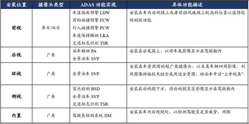 随着汽车驾驶自动化发展,特别是 ADAS 渗透率提高,车载镜头成为 ADAS车道偏离预警、交通标志识别等众多功能实现的必备传感器组件。根据安装位置的不同,可分为前视、后视、环视、侧视、内置五种,将与雷达等其他车载传感器共同作用,感知汽车行驶过程中的环境变化,进行动态、静态物体识别、侦测及追踪,从而预先告知驾驶者潜在风险,以提升驾驶的安全性及舒适性。