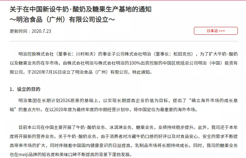 “本次在广州设立生产公司,可以为之前无法享受到服务的消费者带来我司的商品,我们认为也能够让MEIJI的品牌进一步渗透下去。”该公司称。