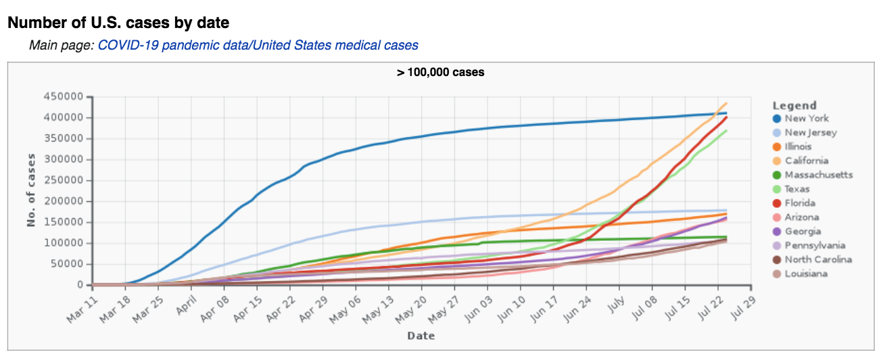 据《纽约时报》测算,照此下去,未来3周左右,佛州便会超越加州,成为全美疫情的新震中。当地时间7月22日,加州已经超越纽约州,成为美国新冠肺炎确诊病例数最多的州。