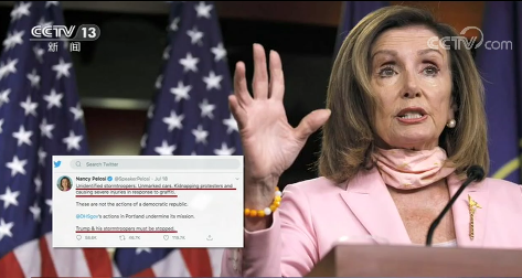 众议院议长佩洛西也在推特发文称:“不明身份的帝国风暴兵,没标识的车,为了几个涂鸦就绑架伤害抗议者。特朗普和他的帝国风暴兵必须被阻止”。