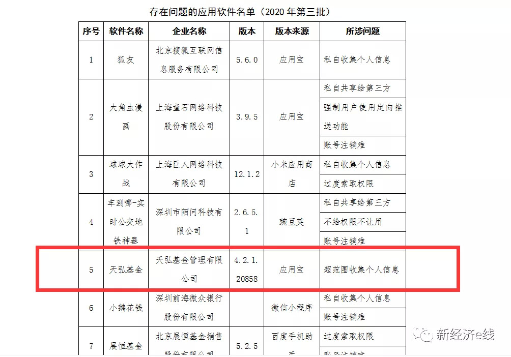 新经济e线注意到,在存在问题的应用软件名单(2020年第三批)中,天弘基金就因超范围收集个人信息而榜上有名。
