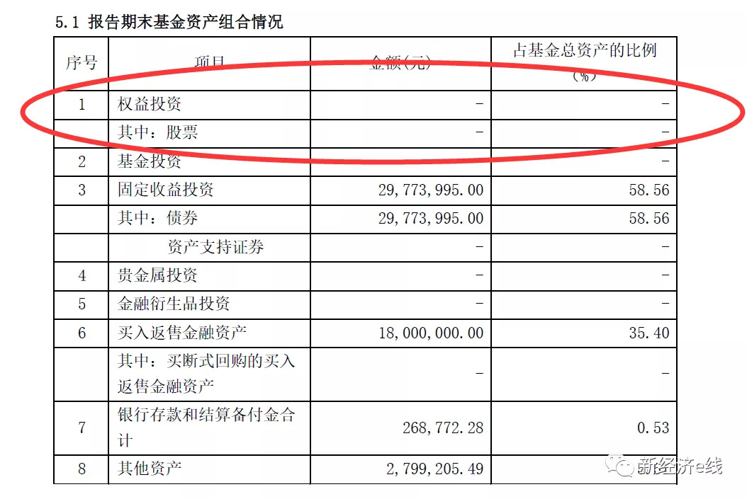 而且,令人意外的是,新经济e线调查发现,作为一只主动权益类基金,从2018年6月30日至2020年6月30日,天弘裕利竟然连续9季保持股票仓位为零。
