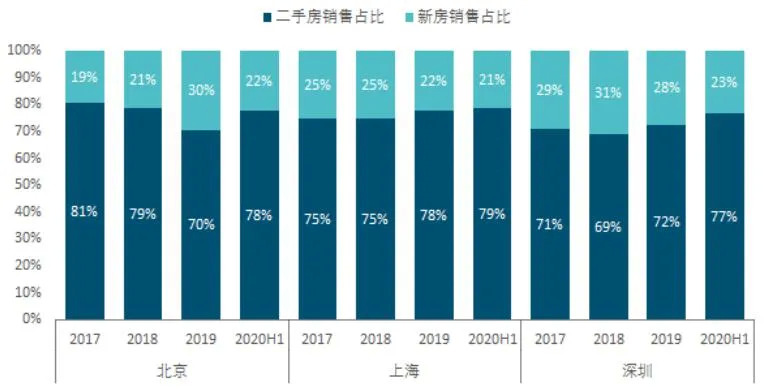 图:2017年至2020年上半年北上深新房及二手房成交套数占比