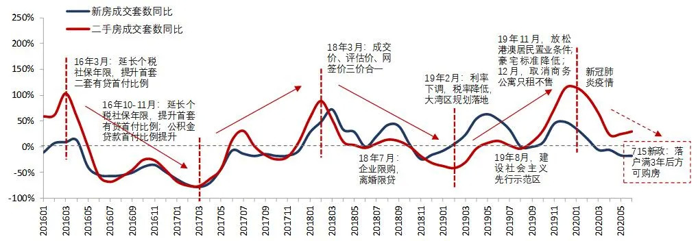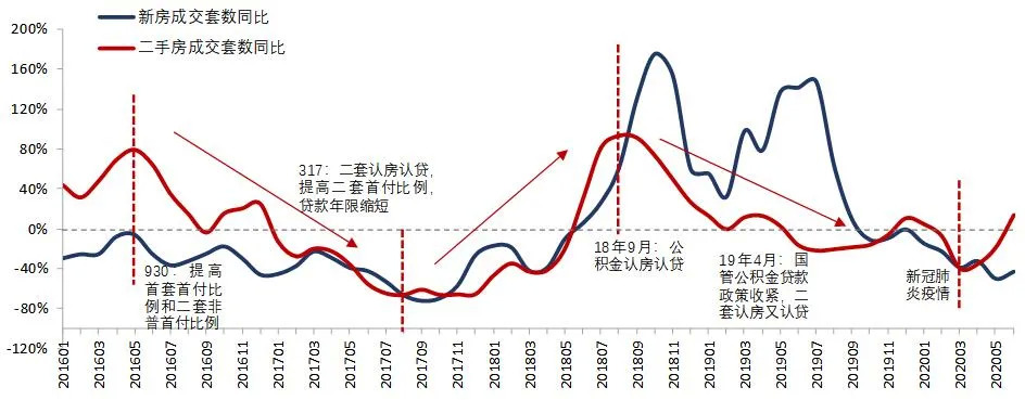 图:2016年1月至2020年6月新房和二手房成交套数同比变化