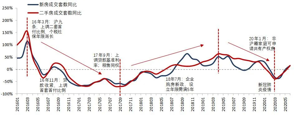 图:2016年1月至2020年6月上海新房和二手房成交套数同比变化