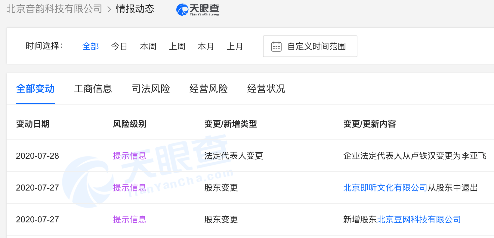 天眼查数据显示,7月27日,北京音韵科技有限公司发生股东变更,北京即听文化有限公司从股东中退出,新增股东为豆瓣网所属公司北京豆网科技有限公司,认缴金额520万人民币,持股比例52%。7月28日,该公司法定代表人从卢铁汉变更为李亚飞。李亚飞同时也是北京豆网科技有限公司董事长。