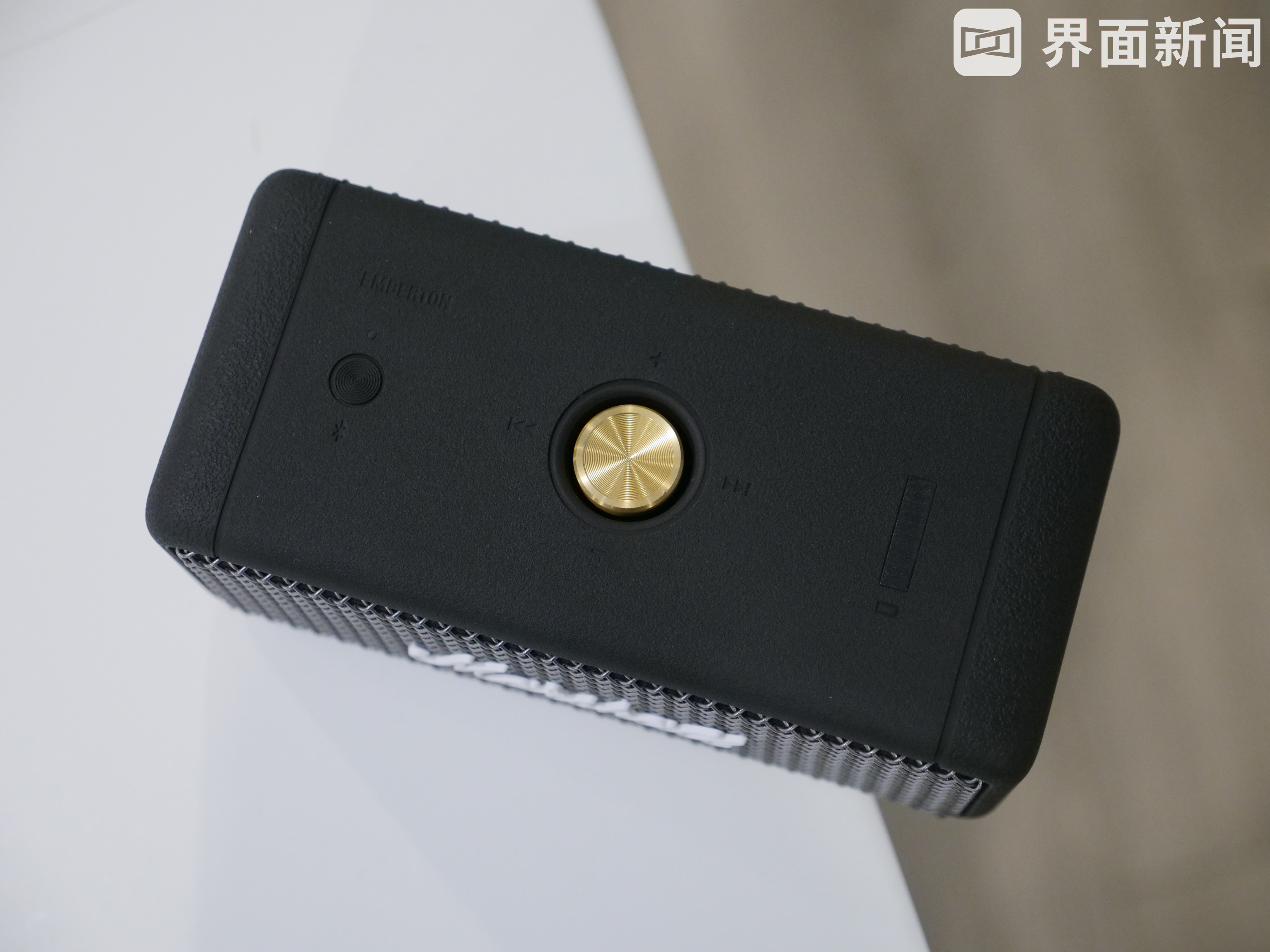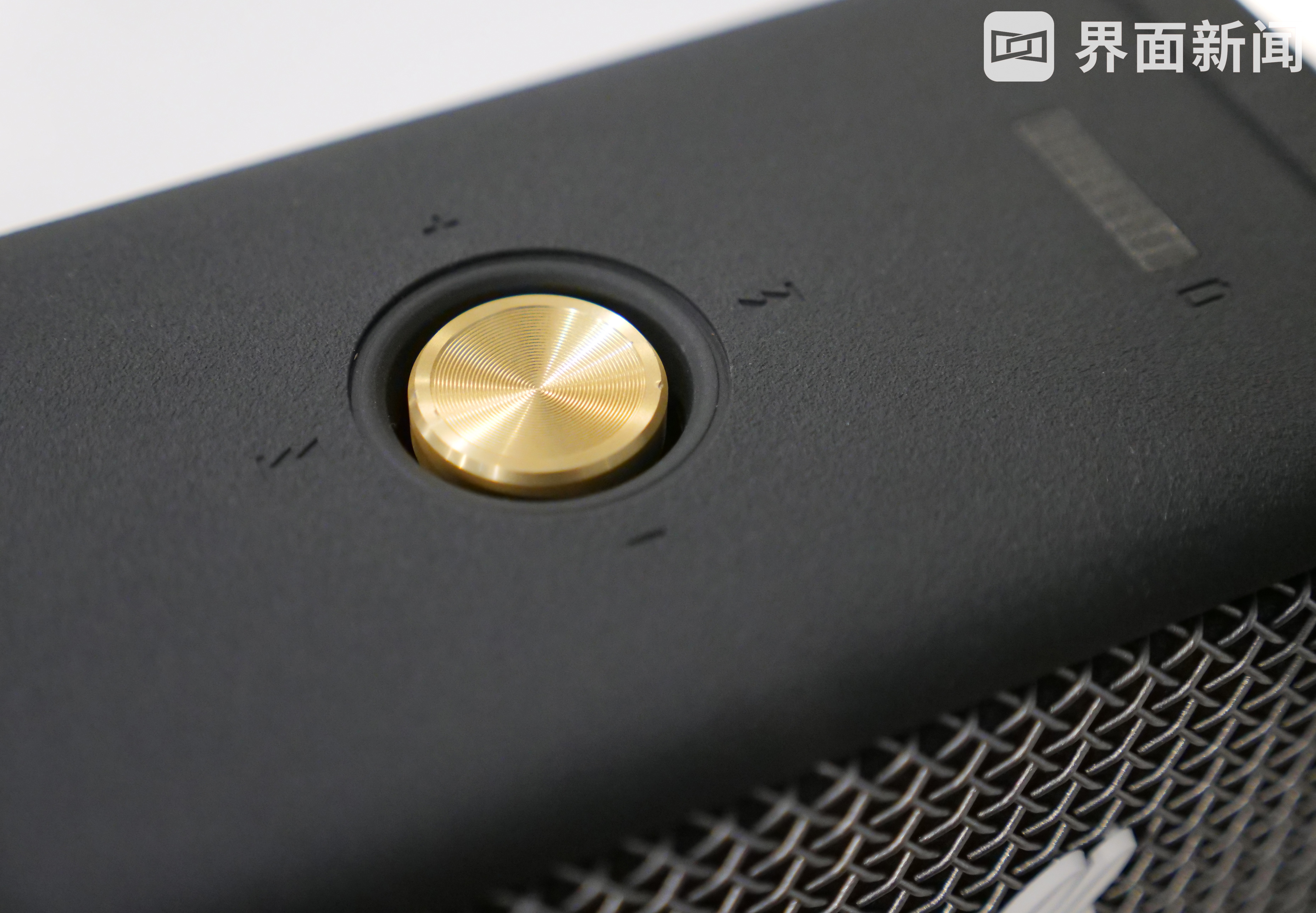 顶部左侧是蓝牙连接按键,右侧是电量指示灯,中间则为多向控制旋钮,可以按压也支持往不同方向推动,包括调节音量、开关音箱、播放暂停等常规操作,旋钮金色的质感也算是音箱整体低调观感中的一抹亮色。