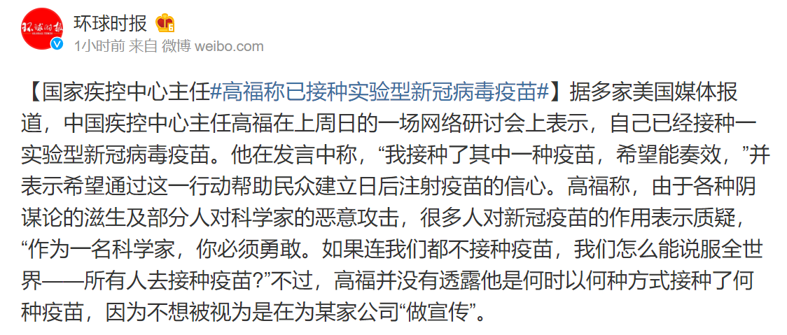 环球时报消息,据多家美国媒体报道,中国疾控中心主任高福在上周日的一场网络研讨会上表示,自己已经接种一实验型新冠病毒疫苗。他在发言中称,“我接种了其中一种疫苗,希望能奏效,”并表示希望通过这一行动帮助民众建立日后注射疫苗的信心。