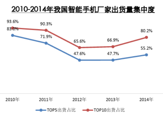 据中国信息通信研究院统计,2012年国内智能手机厂商TOP5出货集中度为47.6%,2013年为47.7%。2011年、2010年分别为71.9%、83%,2014年回升至55.2%。2012年、2013年市场集中度处于谷底时,TOP5留给其他品牌的市场空间在50%以上,意味着这段时间切入的成功几率最高。
