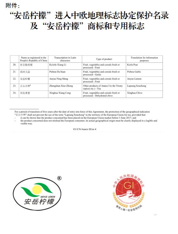 据国家知识产权局消息,当地时间7月20日,欧盟理事会授权正式签署中欧地理标志协定,“安岳柠檬”成功入选首批欧盟保护地理标志名单。该协定是欧盟与中国之间签署的第一份意义重大的双边贸易协定,协定对地理标志产品设定了高水平的保护规则,确保来自欧盟和中国的各100个地理标志产品在对方市场上得到保护。