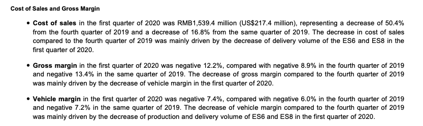 需要注意的是,根据蔚来2020年的一季度财报显示,其整车销售毛利率为-7.4%,环比与同比的毛利率分别下降1.4%和0.2%。整车销售亏损仍在小幅扩大。