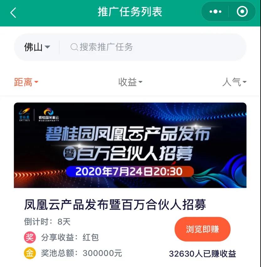 加入合伙人,参与楼盘推广即可轻松赚取收益,在凤凰云小程序上,一分钟就可以在平台上开通个人店铺。合伙人可以将碧桂园的楼盘、优惠活动、推广任务添加到个人店铺,打造自己专属的个人线上房产店铺,打造个人长期稳定的副业平台。