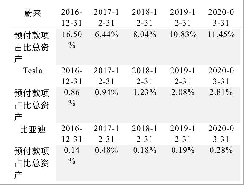 从预付项目指标来看,蔚来近几年预付款项占比总资产最高达到了16.50%,最低也有6.44%。而特斯拉最高不到3%,比亚迪最高不到0.5%。