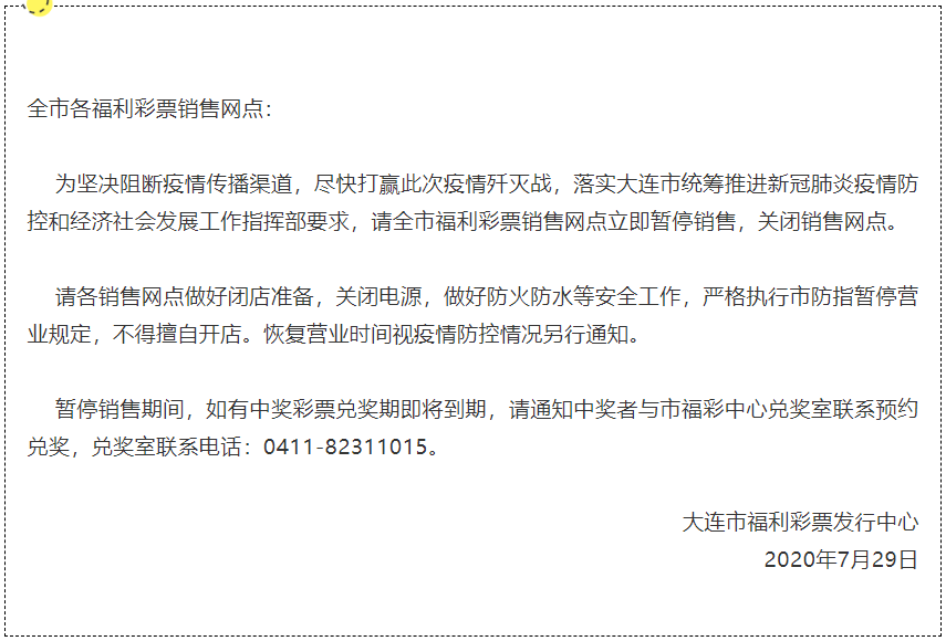 据大连市福利彩票发行中心29日消息,为落实大连市统筹推进新冠肺炎疫情防控和经济社会发展工作指挥部要求,全市福利彩票销售网点立即暂停销售,关闭销售网点。各销售网点需做好闭店准备,关闭电源,做好防火防水等安全工作,严格执行市防指暂停营业规定,不得擅自开店。恢复营业时间视疫情防控情况另行通知。