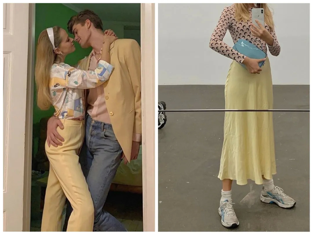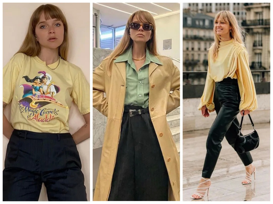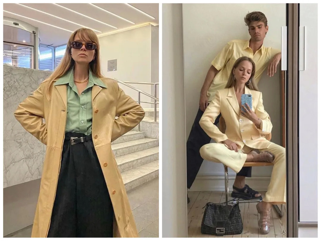 而除了甜美的裙装,没有明显性别感的黄油色,用来做西装、风衣也相当可以。