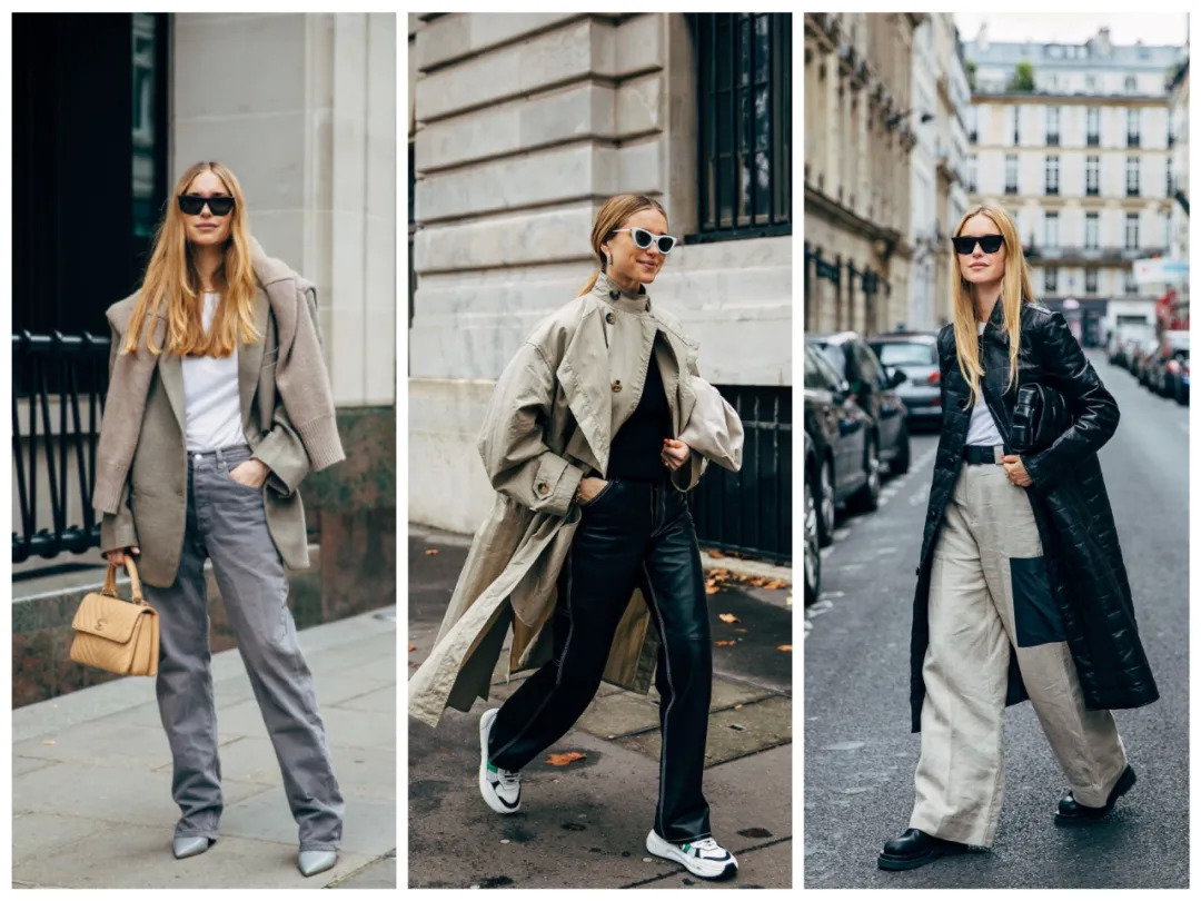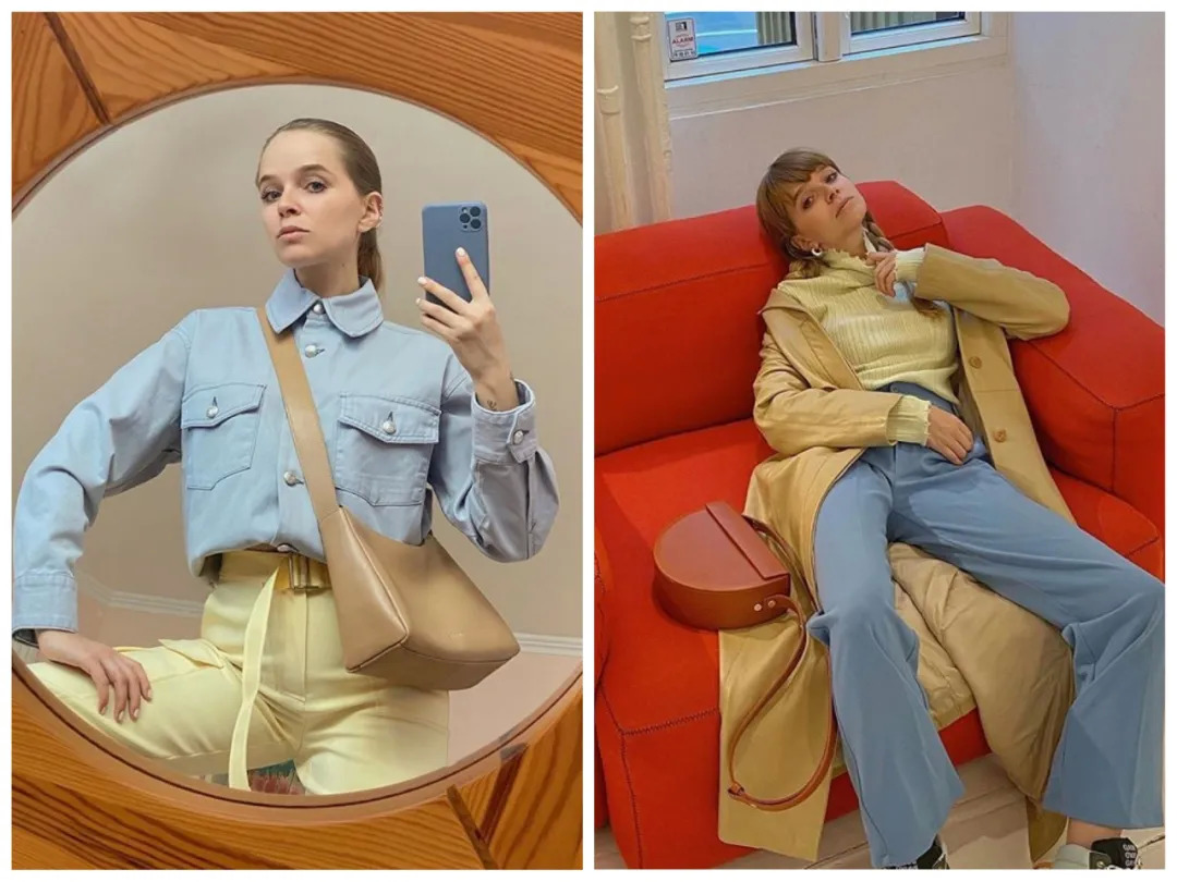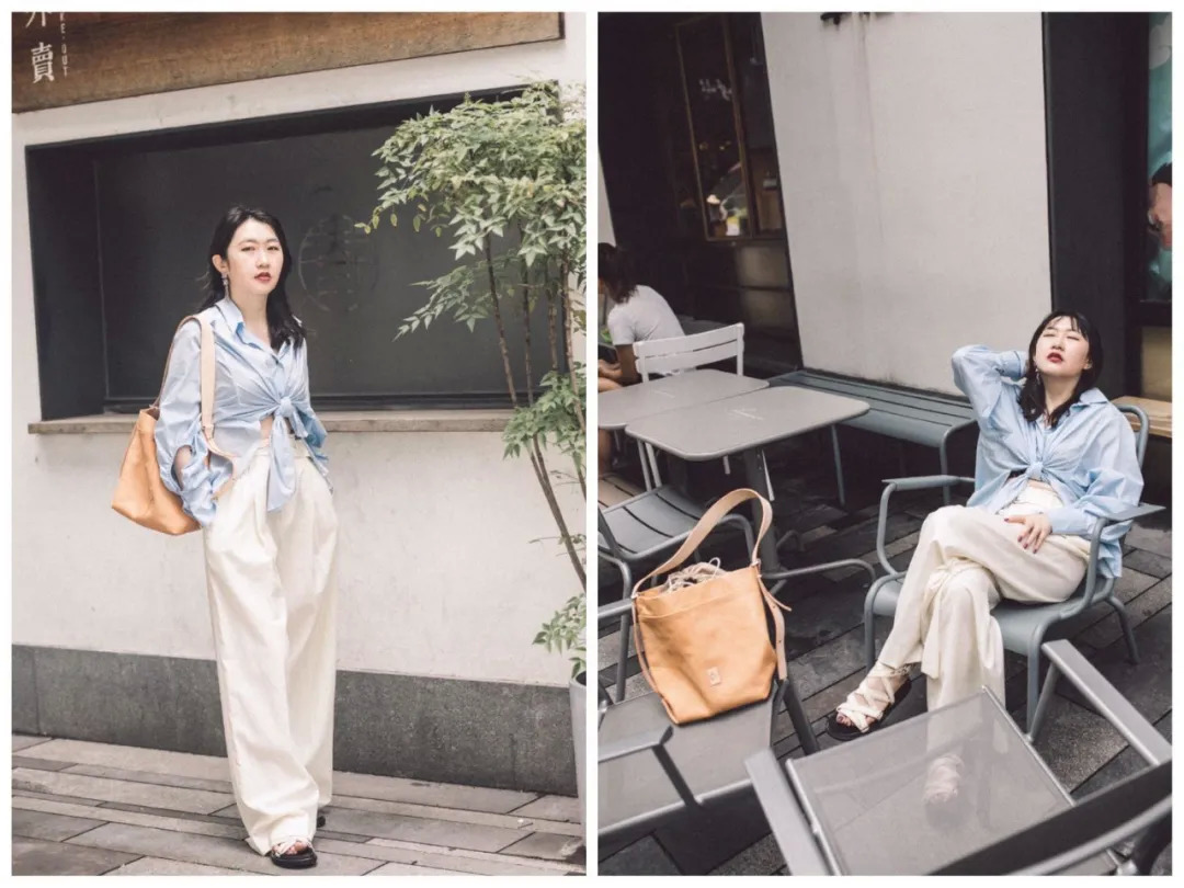 但廓形、硬挺感面料,才更有Scandi的味道。饼boss这身,清水蓝+白色阔腿裤+棕色包包,配色很有北欧的感觉了 。