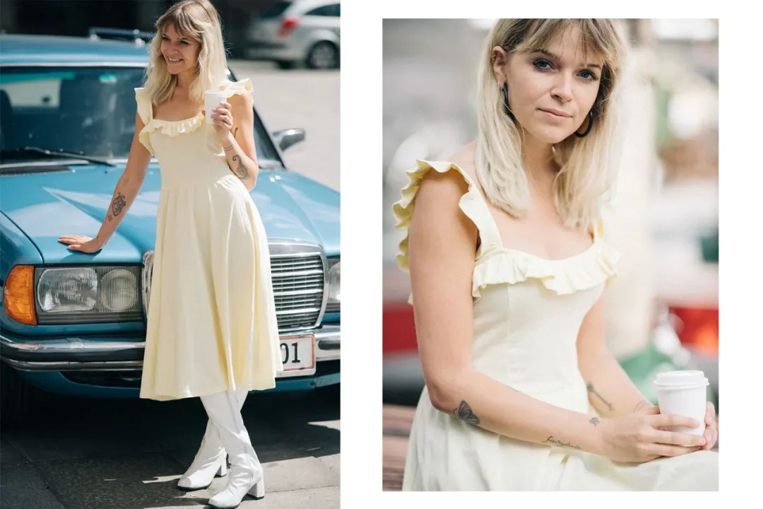 Marie给H&M拍的这组 ,Miss 烧饼一眼就相中了这条黄油色的连衣裙。