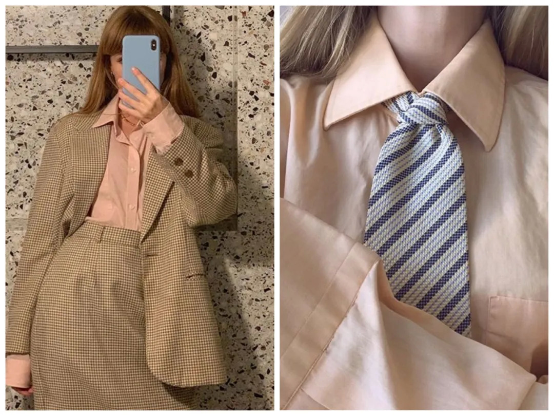 像Marie这样,搭配西装套裙和领带,简直时髦到飞起 !