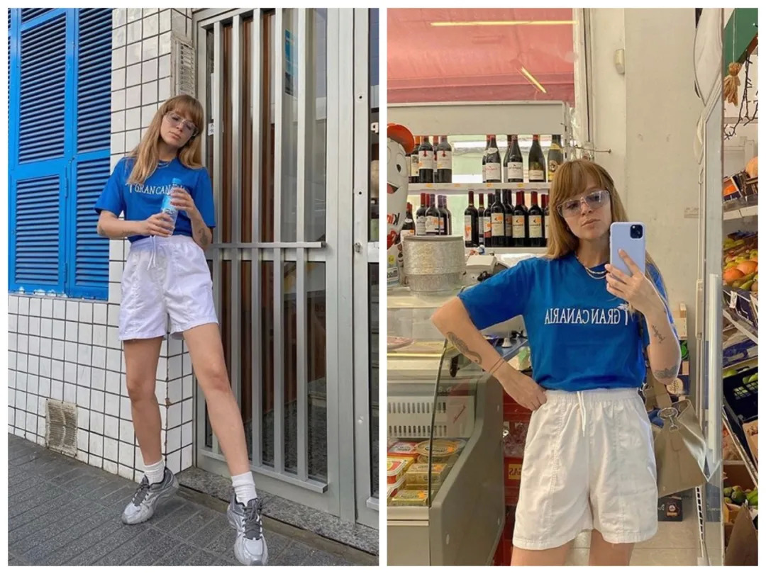 这一身 ,蓝T恤+白短裤,印花与下装、鞋袜呼应,非常“scandi cool”了。