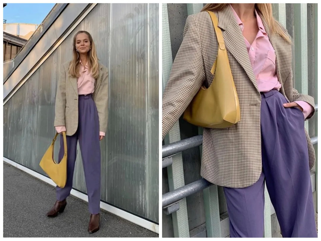 包括Miss 烧饼挚爱的这套,粉+紫+黄+棕,四色和谐地组合在一起,穿出街根本不怕撞look ~