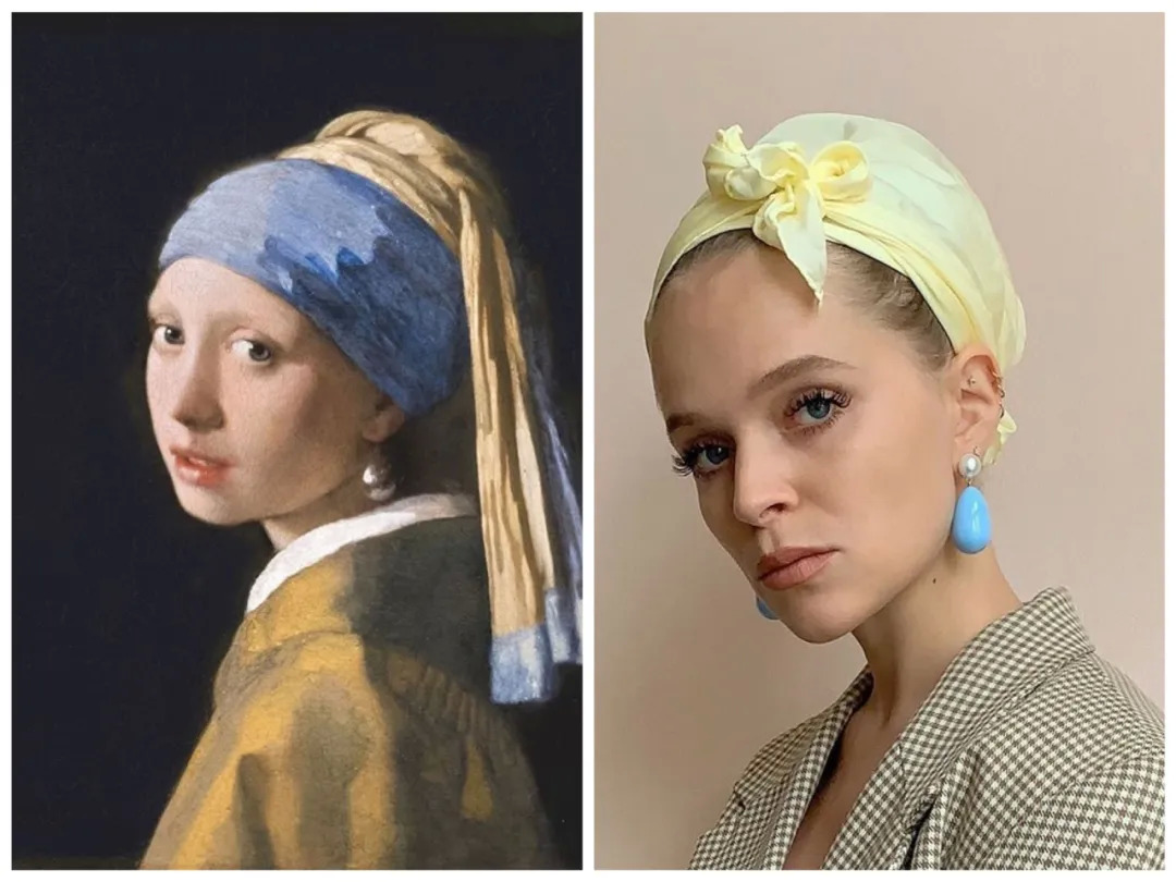 这幅《戴珍珠耳环的少女》,Marie致敬过相似的look,把珍珠换成亚克力,更符合她俏皮的风格。蓝+黄油色,美得如油画一般 。