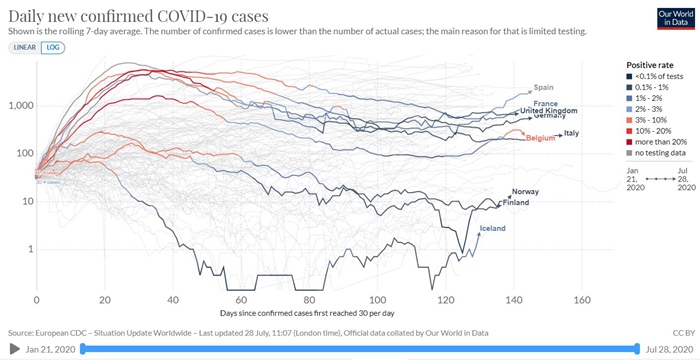 虽然新增确诊人数远低于西班牙,过去三周,比利时的新增确诊幅度在各国中名列前茅。