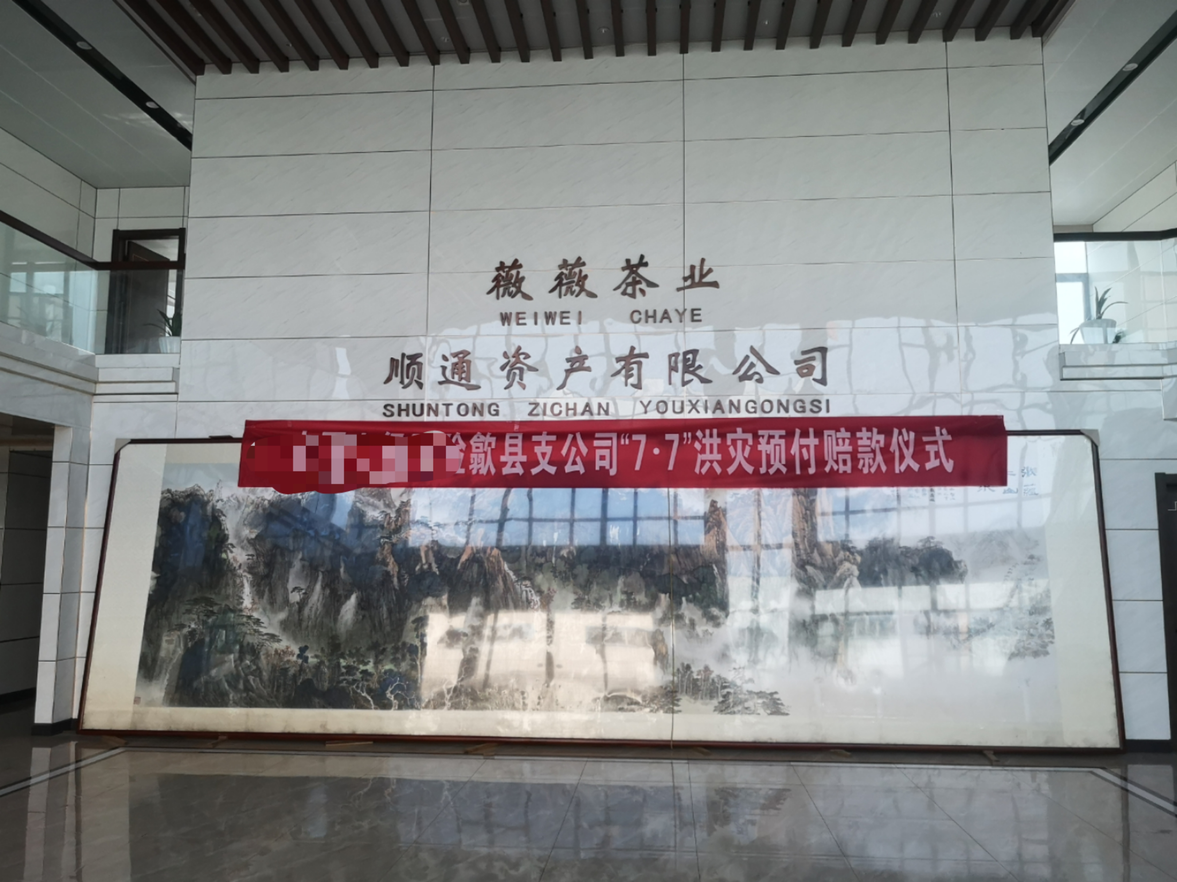 7月10号,薇薇茶叶的2层办公楼里举行了一场赔付仪式,红色条幅上写着“某保险公司7·7洪灾预付赔款仪式”,薇薇茶叶获得了保险公司预赔付的500万余元。